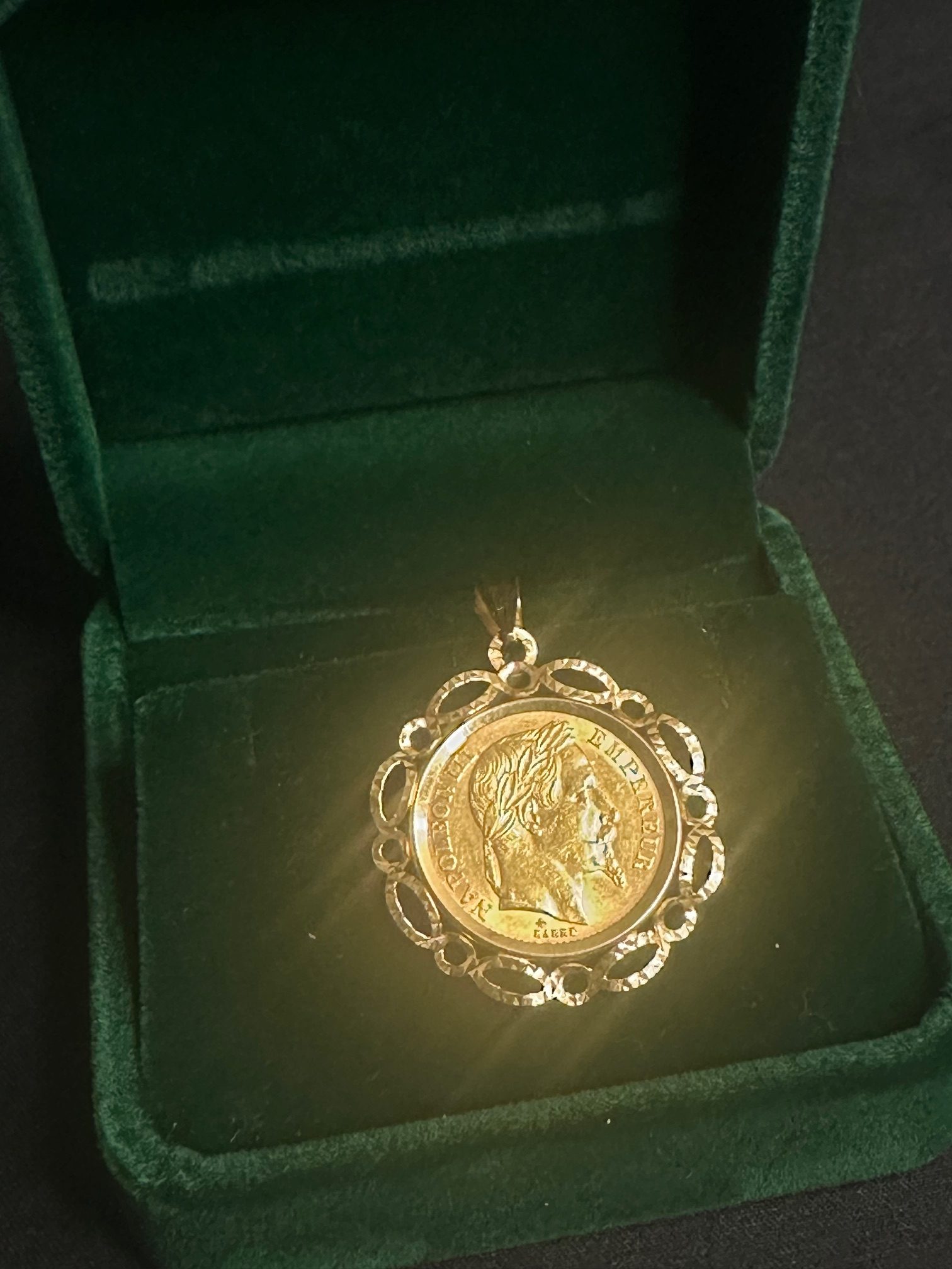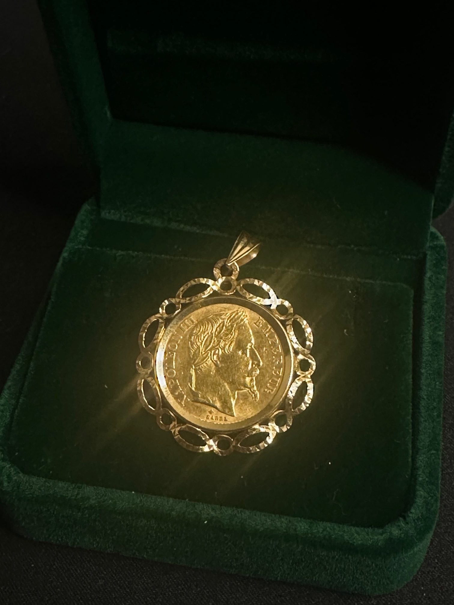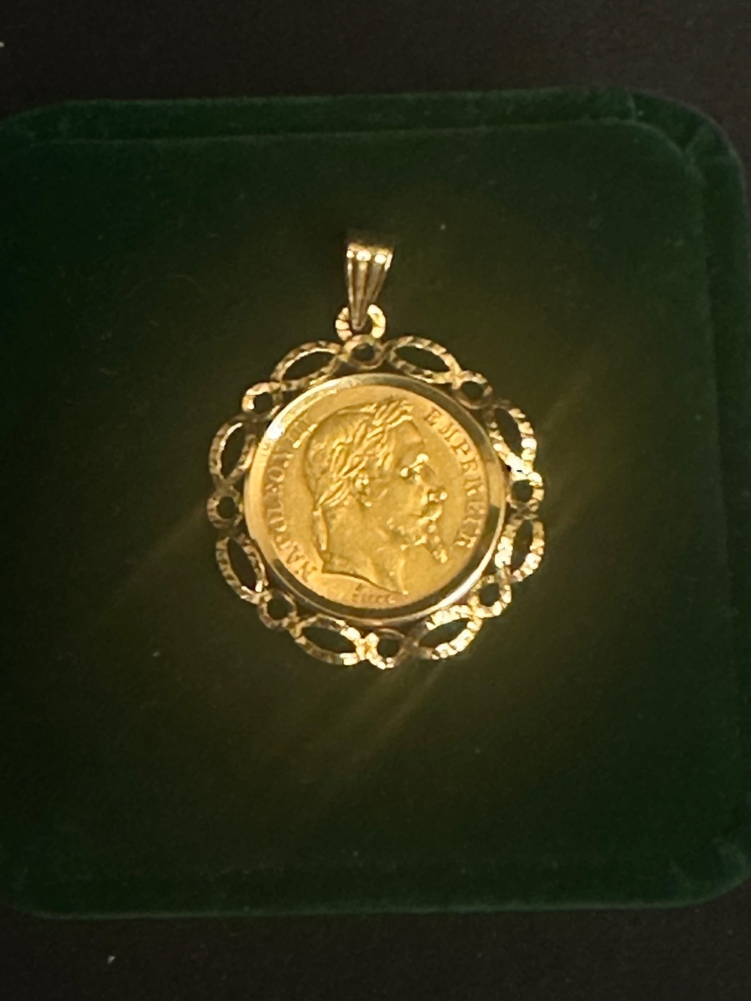 Pendentif pièces de 20fr en 18 carat 750/1000 la pièce est en 22 carat poids de la pièce 6.45Gr poids total du pendentif 8.4Gr